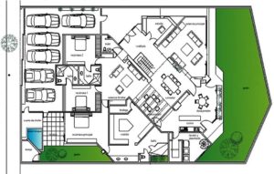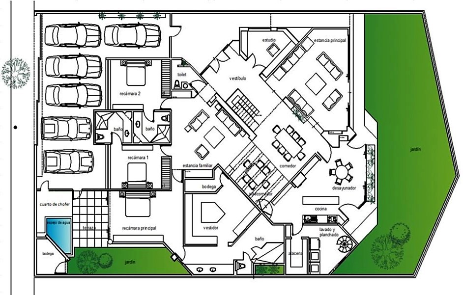 * Estudio, sala familiar, salón fiestas, bodegas, cuarto servicio y choferes.